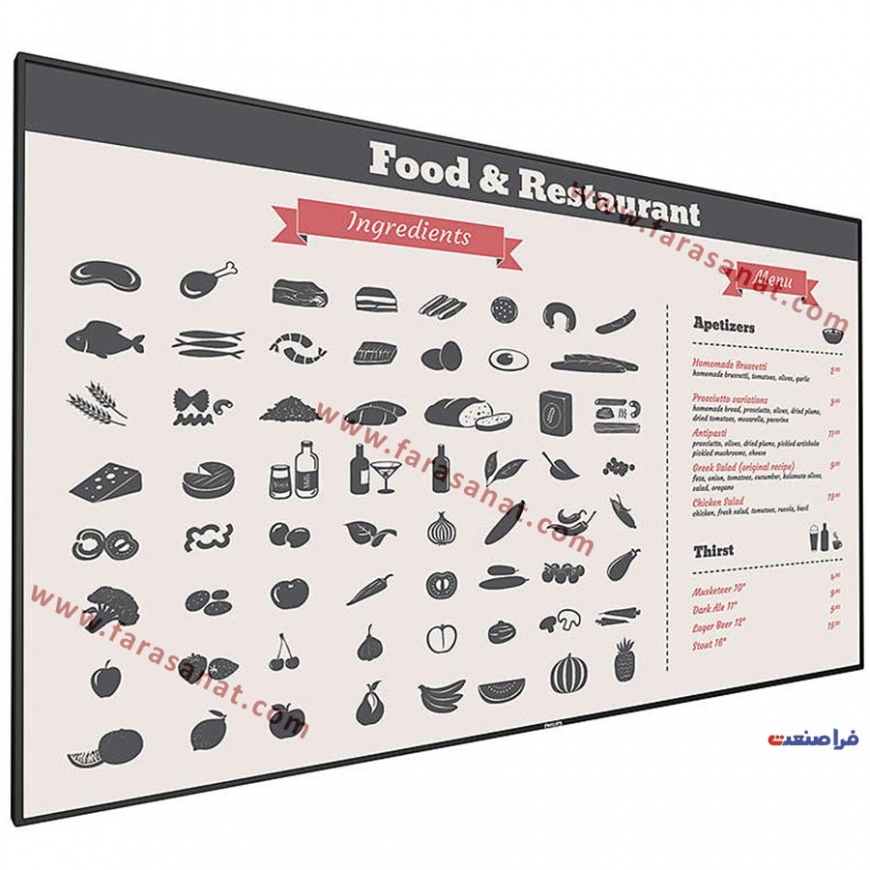 امکانات چیدمان: Portrait,Landscape ابعاد ابعاد: 1092.8 * 623.0 * 56.8 میلیمتر VESA Mount : 400x400 میلیمتر M6 شرایط کاری دمای کاری: 0×40 درجه سانتیگراد صدا بلندگوی داخلی: 2 عدد 10 وات لوازم جانبی کنترل از راه دور، باتری، راهنمای استفادهVGA ، کابل RS232 کابل برق، کابل و راهنمای راه اندازی سریع |